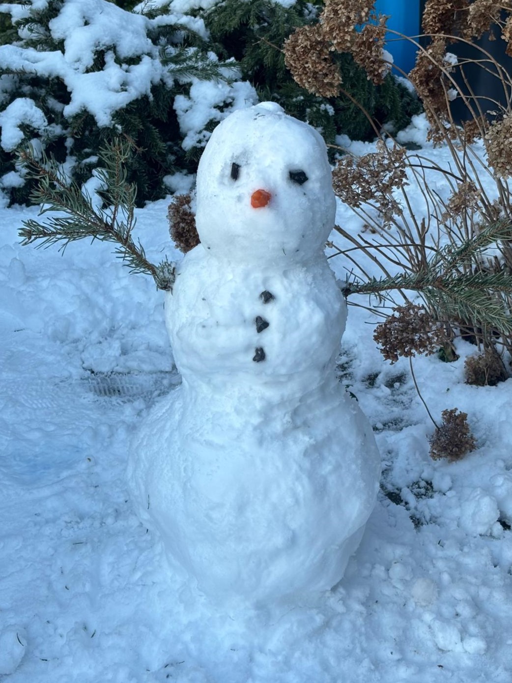 Ambitieus begon ik aan een sneeuwpop, maar ik kwam er heel snel achter hoe zwaar het maken van een sneeuwpop is. Dus een mini-pop. Inclusief zielige kerstboom op de achtergrond.